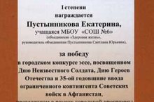 Пустынникова Екатерина, ученица 8А класса заняла 1 место в городском конкурсе эссе, посвященном Дню Неизвестного Солдата, Дню Героев Отечества и 35-ой годовщине ввода ограниченного контингента Советских войск в Афганистан. Поздравляем!