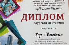 Поздравляем детский хор младших классов "Улыбка" (руководитель Маткаримова Ф.А.) - участника III городского конкурса - фестиваля хоровой музыки "Поющие Челны" с получением звания лауреата 3 степени!