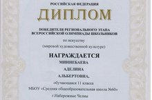 Миннебаеву Аделину, ученицу 11 А класса, Прасову Фиалку Исмагиловну, учителя искусства, с победой на региональном этапе Всероссийской олимпиады по МХК