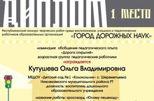 Поздравляем воспитателя Кутушеву Ольгу Владимировну с победой в Республиканском конкурсе творческих работ среди воспитанников, учащихся и педагогических работников образовательных организаций "Город дорожных наук". Желаем Ольге Владимировне и её воспитанникам творческих успехов и достижений!