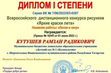 Поздравляем нашего воспитанника старшей группы Кутушева Рамзана с победой во Всероссийском конкурсе "Яркие краски лета".