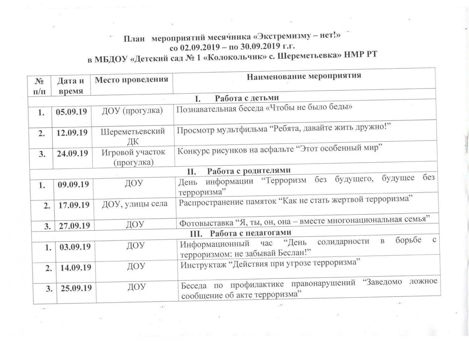 Со 02 сентября по 30 сентября стартовал месячник "Экстремизму - нет!" С планом мероприятий в ДОУ Вы можете ознакомиться, пройдя по ссылке.