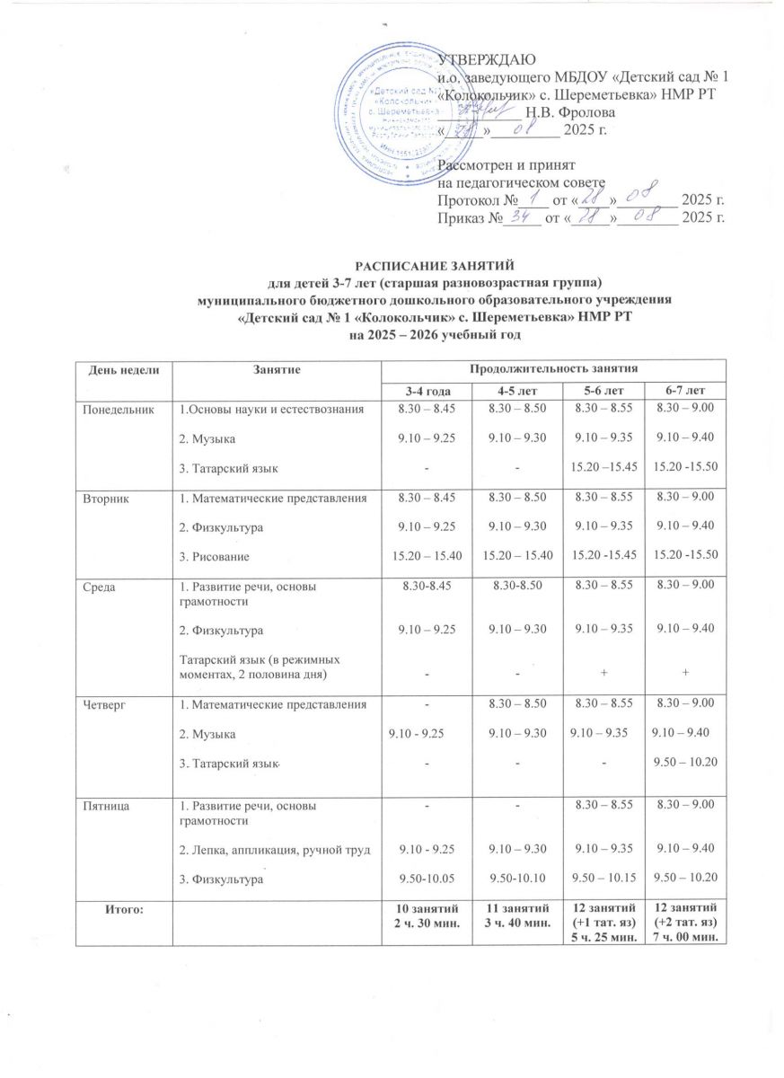 Расписание занятий для детй от 3 до 7 лет на 2025-2026 учебный год