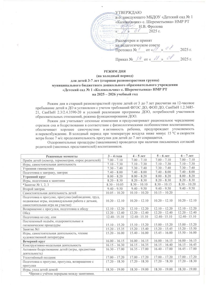 Режим дня для детей от 3 до 7 лет на 2025-2026 учебный год