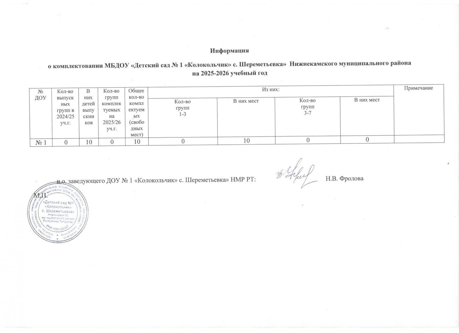 Информация о количестве мест в МБДОУ "Детский сад № 1 "Колокольчик" с. Шереметьевка" НМР РТ на 01 сентября 2025 г.