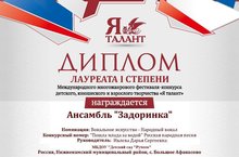 Ансамбль, состоящий из воспитанников старших и подготовительной к школе групп стал Лауреатом I степени Международного фестиваля детского творчества «Я талант» (руководитель ансамбля - Ивлева Д.С.).Фестиваль прошел в Крыму, в г. Алушта с 29 июня по 9 июля 2018 г. Представительное лицо Фестиваля в Российской Федерации – Благотворительный фонд культурно-социальных инициатив им. И.С. Тургенева.