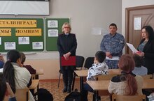 Так в ходе открытого урока росгвардейцы рассказали ученикам о значении Сталинградской битвы, о героизме и мужестве советских солдат и офицеров, подвигах медсестер и простого народа. Поведали об участии в великой битве войск НКВД. «Великая Сталинградская битва, продолжавшаяся 200 дней и ночей, завершилась 2 февраля 1943 года полным разгромом немецкой армии. Победа на Волге переломила ход войны. Наша армия стала наступать и победоносно завершила войну в Берлине в мае 1945 года», - отметили в выступлениях капитан полиции Людмила Трубина и старший лейтенант полиции Андрей Жаворонков. Гости также обратились к подросткам с напутственным словом и напомнили, что победа под Сталинградом стала результатом несгибаемой стойкости, мужества и героизма воинов, в том числе из нашей республики. Виртуальный экскурс в историю и хронологию переломного этапа Великой Отечественной войны сопровождался демонстраций тематических слайдов и видеоролика о тех тяжелых временах для Сталинградской земли. Аудитория с неподдельным интересом и вниманием слушала рассказчиков. В завершении занятия, правоохранители проинформировали учащихся об особенностях службы в войсках.Встречу организовала учитель Гафиуллина Р.Р.