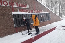 Члены отряда Юнармия очистили от снега территорию памятника воинам Великой Отечественной войны.