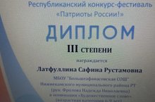 Поздравляем ученицу 2 Б класса Латфуллину Сафину , занявшую 3 место в Республиканском конкурсе-фестивале "Патриоты России" в номинации "Художественное слово" !