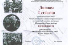 Диплом 1 степени муниципального этапа Республиканского военно-патриотического фестиваля "Я помнить призываю" номинация "Дети войны" награждается ДОО "Звездная" педагог Хохлова Н.А. 16.11.2018