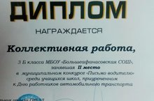 Награждается коллективная работа, 3 б класса МБОУ "Большеафанасовская СОШ" занявшая 2 место в муниципальном конкурсе "Письмо водителю" среди учащихся школ, приуроченном к Дню работников автомобильного транспорта 07.12.2018