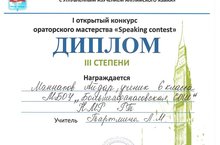С целью повышения уровня свободного владения английским языком и совершенствования навыков устной речи на базе МБОУ "СОШ № 33" прошел первый Открытый конкурс ораторского мастерства "Speaking Contest". В категории "Учащиеся 4-6 классов" призовое 3 место занял ученик 6 класса Маннапов Айдар. Вниманию жюри и участников конкурса он представил декламацию сонета Шекспира на английском языке. В выступлении Айдара, жюри отметило оригинальности , артистичность, хорошее взаимодействие с аудиторией. 27 апреля состоялась торжественная церемония награждения, где Маннапову Айдару был вручен диплом 3 степени. Поздравляем Айдара с хорошим результатом. Так держать!
