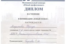 Поздравляем ученицу 7 а класса Мазитову Фариду с тем, что она стала призером конкурса "Юный профессионал", прошедшем 16 ноября в школе № 31 г.Нижнекамска, в номинации "Юный повар"