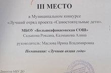 были награждены грамотой за 3 место в муниципальном конкурсе "Лучший отряд проекта "Самостоятельные дети" в номинации «Лучшая акция года» за 2022-2023 учебный год. Руководитель Маслова Ирина Владимировна. Поздравляем!!! -