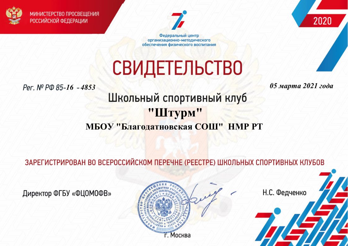 Приказ о создании ШСК, паспорт школьного клуба МБОУ Благодатновская СОШ