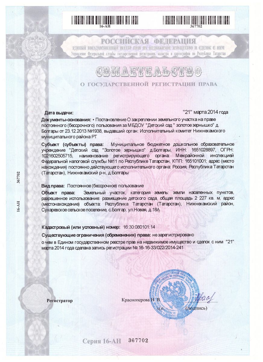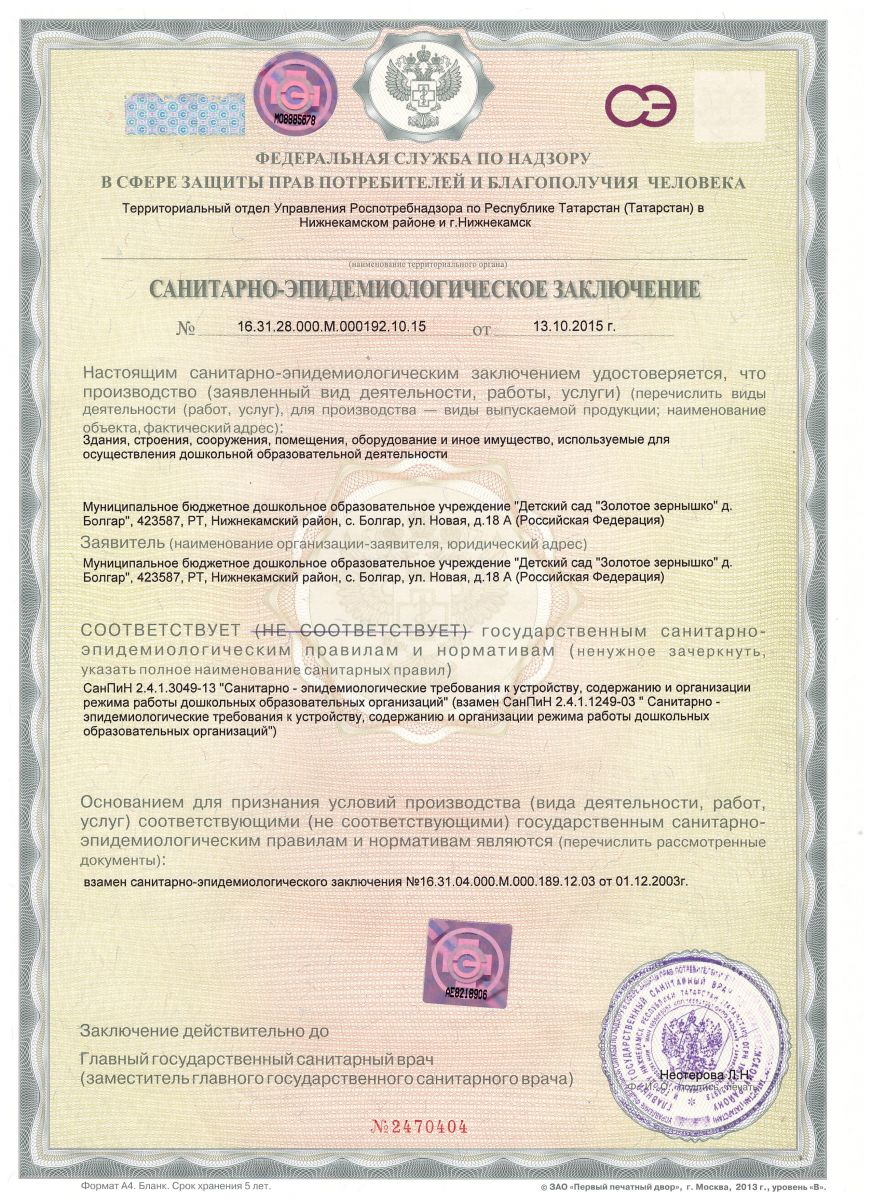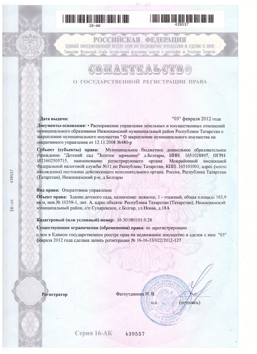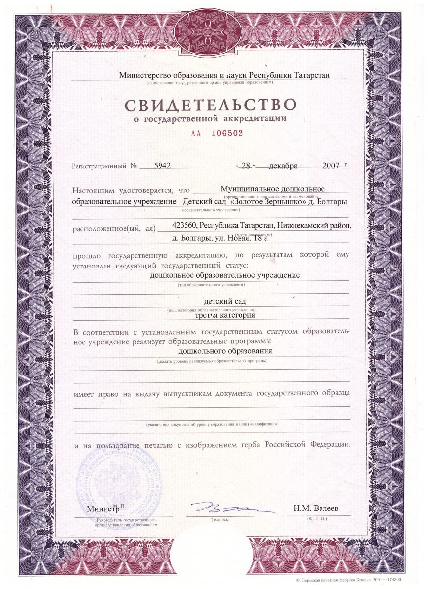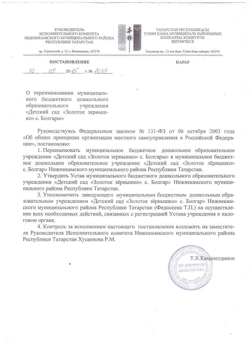 | Короткое название: | МБДОУ "Детский сад"Золотое зёрнышко"с. Болгар" НМР,РТ |