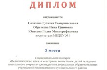 Поздравляем наших воспитателей Салахову Р.Т., Обрезкову Н.Е., Юнусову Г.М. с победой в муниципальном конкурсе "Педагогические идеи в сенсорном воспитании детей младшего дошкольного возраста " . Желаем им крепкого здоровья и творческих успехов!