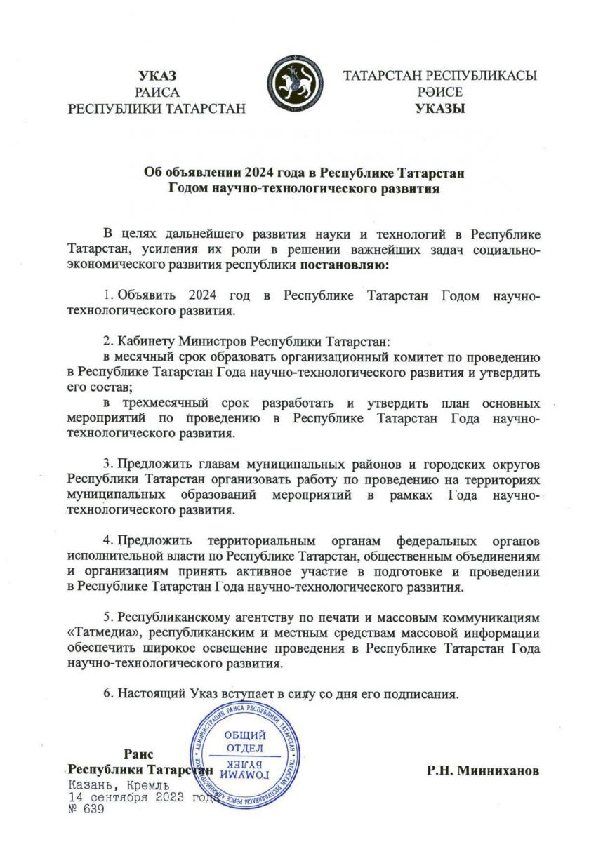 2024 год-объявлен в Республике Татарстан Годом научно- технологического развития 15.01.2024