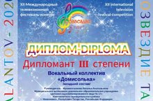 Музыкального руководителя детского сада Мухаметгалиеву Наталью Анатольевну, детей вокального ансамбля "Домисолька" и воспитанника Абзалова Амира поздравляем с победой в XII Международном телевизионном фестиваль-конкурсе "Созвездие талантов - 2020", они дипломанты III степени. Оргкомитет и дирекция Международного конкурса, а также коллектив детского сада выражают искреннюю благодарность Наталье Анатольевне за активное участие, профессиализм, высокое мастерство, энтузиазм и самоотдачу подрастающему поколению.