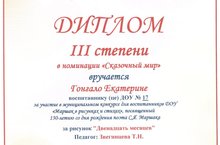 На базе МБДОУ Д/с №9 прошел муниципальный конкурс для воспитанников дошкольных образовательных учреждений «Маршак в рисунках и стихах», посвященный 130-летию со дня рождения поэта С.Я. Маршака. Наш сад на конкурсе рисунков представила воспитанница подготовительной к школе группы №6 Гонгало К. с работой "Двенадцать месяцев", где заняла почетное III место в номинации "Сказочный Мир". Поздравляем Катюшу с победой и желаем дальнейших творческих успехов!