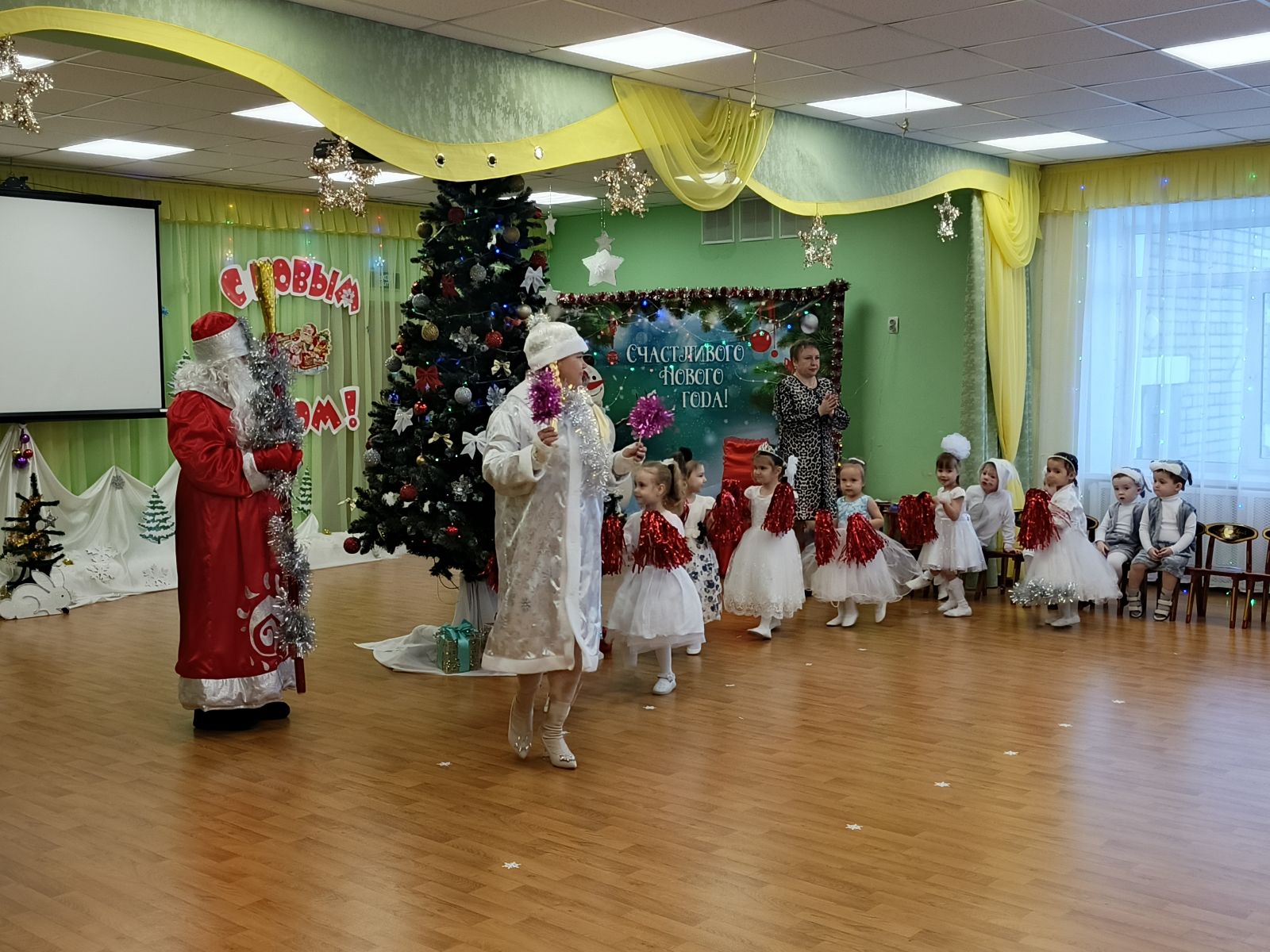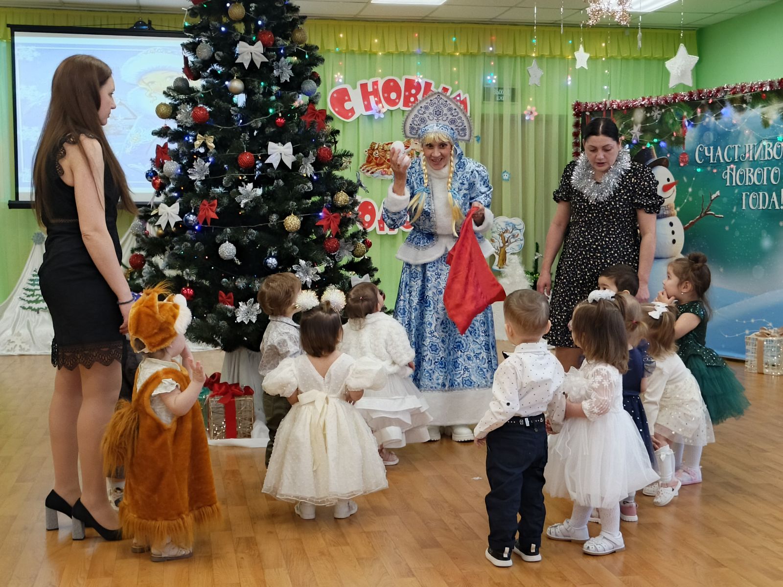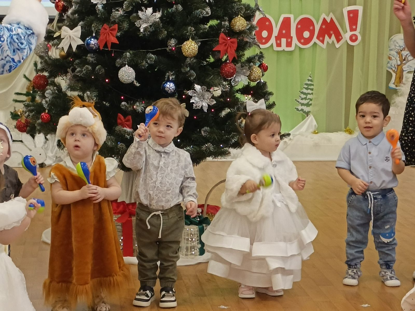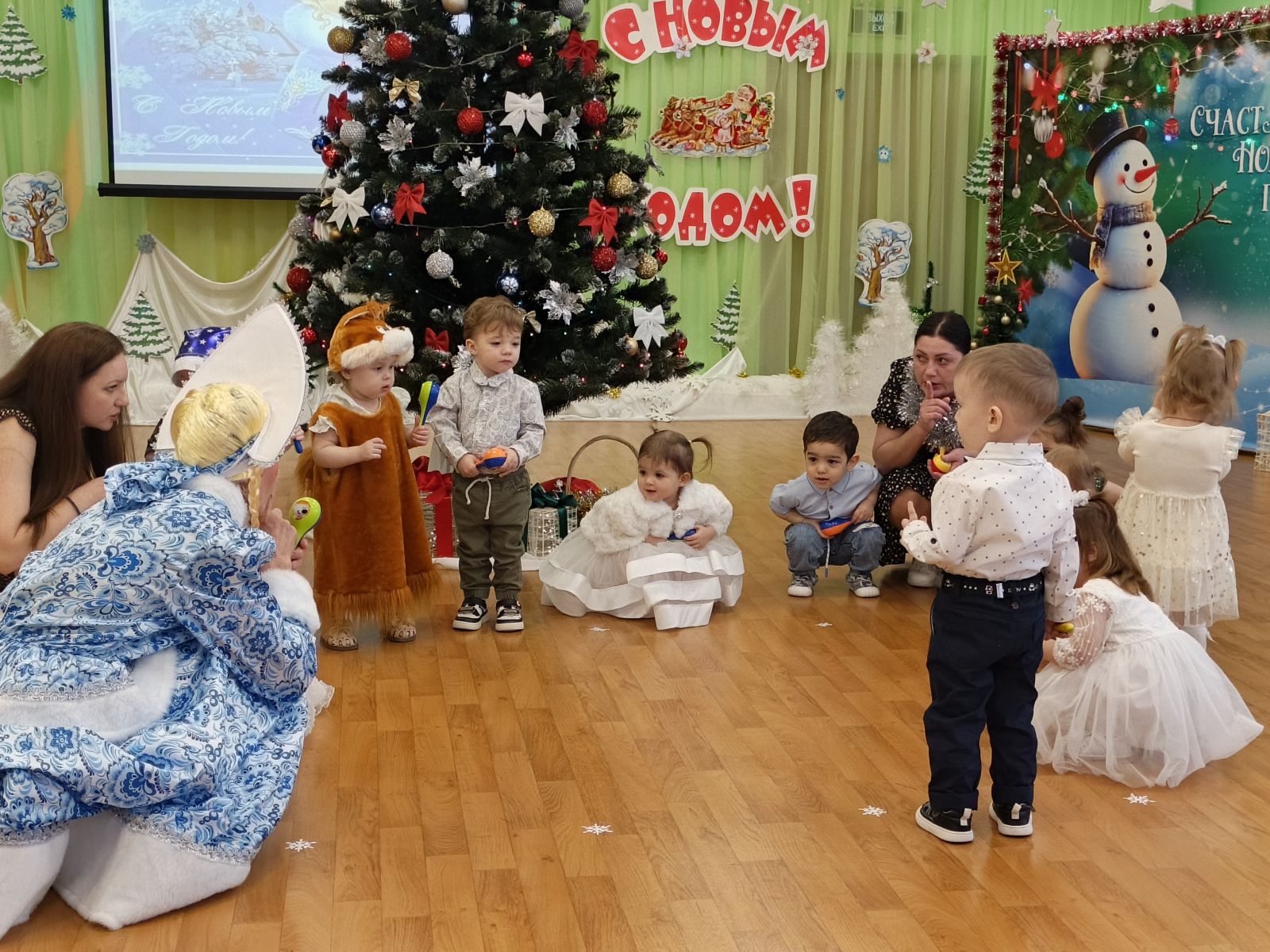 Самые маленькие ребятишки (1-2 года) в первый раз очутились в атмосфере новогоднего чуда и веселья. Пели, плясали и играли вместе со Снегурочкой. И подарки не заставили долго себя ждать.