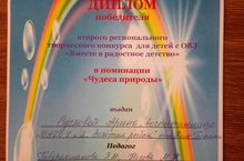 Второй региональный творческий конкурс для детей с ОВЗ «Вместе в радостное детство». Воспитанница подготовительной к школе группы №10 Суслова Арина и воспитатели Габдрахманова З.М., Носова М.Н. награждены Дипломом победителя в номинации «Чудеса природы». ПОЗДРАВЛЯЕМ!!! 25.12.2017