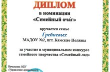 Муниципальный конкурс семейного творчества «Семейный лад» . Воспитатель Гребнева Ирина Геннадьевна награждена Дипломом МБУ "УДО" в номинации "Семейный очаг". ПОЗДРАВЛЯЕМ!!! 30.10.2017