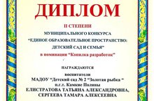 Муниципальный конкурс «Единое образовательное пространство: детский сад и семья» среди педагогов ДОУ НМР РТ. Воспитатели Елистратова Т.А., Сергеева Т.А. – Диплом II степени в номинации «Копилка разработок»; Исаева Т.А. – Диплом участника в номинации «Копилка разработок»; Енизеркина Л.Н. – Диплом участника в номинации «Инновационный проект» 31.05.2017