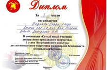 I этап Всероссийского конкурса детско-юношесткого творчества по пожарной безопасности "Неопалимая купина". Дипломом за 1 место награждены воспитанник второй младшей группы №6 Баранов Савва (3 года) и воспитатель Дмитриева Наталья Юрьевна в номинации "Самый юный участник". Еще 15 воспитанников отмечены Сертификатами участника. Поздравляем!!! 21.02.2017