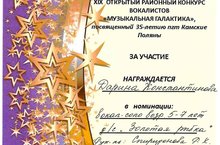 XIX Открытый районный конкурс вокалистов «Музыкальная галактика», посвященный 35-летию пгт Камские Поляны. Музыкальный руководитель Спиридонова Р.Х. и воспитанники Федосеев Максим (средняя группа №9), Ахмадиева Снежана (старшая группа №10), Константинова Дарина (подготовительная к школе группа №12) - награждены Дипломами за участие МБУ «Управление культуры» Исполнительного комитета НМР РТ в номинации «вокал-соло возраст 5-7 лет». Поздравляем!!! 27.03.2017