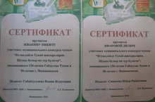 Сертификаты вручаются Яфаровой Диляре и Жвакину Никите участникам муниципального конкурса чтецов "Яттан сөйлә Тукай шигырҗләрен, Шушы булыр иң зур бүләгең", посвященного 130 - летию Габдуллы Тукая и 50 - летию г.Нижнекамска.Педагоги Саматова Изида Рашитовна, Габайдуллина Фания Ильдусовна. 16.05.2016