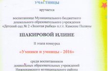 Диплом за участие во 2 этапе конкурса "Умники и умницы-2016" среди воспитанников дошкольных образовательных учреждений Нижнекамского муниципального района вручается воспитаннице МБДОУ "Детский сад №2 "Золотая рыбка" Шакировой Илине.. 23.03.2016