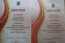 Диплом - за участие в конкурсе мастеров художественного слова, посвященный 130 - летию Г. Тукая и 50 - летию г. Нижнекамска, награждаются воспитанники МБДОУ "Детский сад №2 "Золотая рыбка" Жвакину Никите и Яфаровой Диляре. Педагоги Саматова И.Р., Габайдуллина Ф.И. 08.04.2016