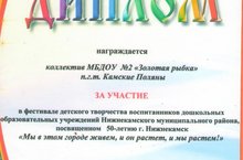Дипломом - награждается коллектив МБДОУ "Детский сад №2 "Золотая рыбка" п.г.т Камские Поляны за участие в фестивале детского творчества воспитанников дошкольных образовательных учреждений Нижнеккамского муниципального района, посвященным 50 - летию г.Нижнекамска "Мы в этом городе живем,и он растет, и мы растем!". 29.04.2016