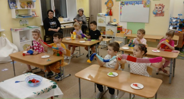 Вот и в старшей группе "Капитошки", дети занимались рукоделием, изготовлением помпона для шарфика.