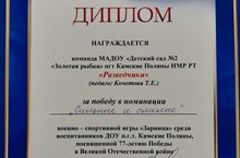 9 Мая. Военно-спортивная игра "Зарница" среди воспитанников ДОУ пгт Камские Поляны, посвященная 77-летию Победы в Великой Отечественной войне. Диплом команде "Разведчики" за победу в номинации "Сильные и смелые" 12.05.2022