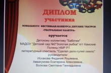 Зональный фестиваль-конкурс детских театров «Театральная палитра»: детский коллектив «Бабочки» и Исхакова Ф.Я., Аввакумова Е.А., Волкова С.Г. – Диплом участника в номинации «Литературное произведение». Поздравляем!!! 25.03.2021