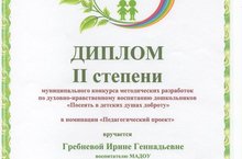 Муниципальный конкурс методических разработок по духовно–нравственному воспитанию дошкольников «Посеять в детских душах доброту»: воспитатель Гребнева И.Г. – Диплом II степени в номинации «Педагогический проект». Поздравляем!!! 26.03.2021