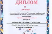 Муниципальный конкурс методических и дидактических пособий, проектов по ознакомлению с космосом для детей дошкольного возраста «Этот загадочный космос»: воспитатели Торопова Е.Н. – сертификат в номинации «Лучшее дидактическое пособие»; Трифонова Н.В. – сертификат в номинации «Лучший макет»; Сергеева Т.А., Гребнева И.Г. – Диплом за 2 место в номинации «Лучшая дидактическая игра». Поздравляем!!! 30.03.2021