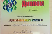 Муниципальный конкурс методических и дидактических пособий по ранней профориентации детей дошкольного возраста «Дошкольник в мире профессий»: воспитатели Торопова Е.Н. – Диплом III степени в номинации «Лучшая дидактическая игра по ранней профориентации»; Докучаева В.Ф., Муравьева С.А. – сертификат в номинации «Лучший видеоролик по ранней профориентации». Поздравляем!!! 30.03.2021