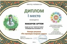 Городской конкурс рисунков «По страницам татарских сказок»: - Абдуллина Амелия и Терехина Н.И. – Диплом III место; - Ахмадуллин Азамат и Елистратова Т.А. – Диплом II место; - Галеев Самат – Диплом III место; - Гребнева Ангелина и Гребнева И.Г. – Диплом II место; - Даутова Азалия и Терехина Н.И. – Диплом I место; - Дубинин Константин и Благодарова И.В. – Диплом II место; - Маслова Елизавета и Сергеева Т.А. – Диплом III место; - Мишакин Даниил и Царева Т.Н. – Диплом III место; - Нуруллина Виталина и Габдрахманова З.М. – Диплом III место; - Соковой Данил и Терехина Н.И. – Диплом I место; - Сычева Злата и Сергеева Т.А. – Диплом III место; - Уткина Ульяна и Благодарова И.В. – Диплом III место; - Хайбуллина Ясмина и Благодарова И.В. – Диплом III место; - Хижняк Дмитрий и Благодарова И.В. – Диплом I место; - Хижняк Дмитрий и Терехина Н.И. – Диплом I место; - Царев Артем и Благодарова И.В. – Диплом III место; - Царева Валерия и Елистратова Т.А. – Диплом III место; - Чайников Вадим и Гребнева И.Г. – Диплом III место; - Чертовских Эрик и Терехина Н.И. – Диплом III место; - Макаров Артем и Исхакова Ф.Я. - Диплом I место. Поздравляем!!! 18.02.2021