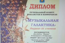 Региональный конкурс вокалистов и конферансье «Музыкальная галактика». Ансамбль «Лилия» (Закирова Л.Р., Орлова Л.И., руководитель: Спиридонова Р.Х.) – Диплом лауреата III степени в номинации «Вокальный ансамбль (возрастная категория 21 и старше)"; - ансамбль «Девчата» (Беляева Е.И., Габдрахманова З.М.) – Диплом участника в номинации «Вокальный ансамбль (возрастная категория 21 и старше)»; - ансамбль «Капель» (руководитель: Спиридонова Р.Х.) – Диплом участника в номинации «Вокальный ансамбль (возрастная категория 5-7 лет)»; - Банников Антон (руководитель: Спиридонова Р.Х.) – Диплом участника в номинации «Вокал соло (возрастная категория 5-7 лет)». 03.03.2021