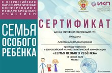 III Всероссийская научно-практическая конференция с Международным участием «СЕМЬЯ ОСОБОГО РЕБЁНКА». Воспитатель Алешина А.В. – Сертификат 19.11.2020