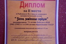 Районный Фестиваль-конкурс патриотической песни "Песни, рожденные сердцем", посвященный 75-летию Победы в ВОВ 1941-1945 г.г. и 100-летию образования ТАССР. Трио "Солдаты" (воспитанники подготовительных к школе групп: Баранов Савва, Токарев Давид, Колесников Иван) и музыкальный руководитель Спиридонова Р.Х. награждены Дипломом II степени в номинации "вокальный ансамбль 6-9 лет". ПОЗДРАВЛЯЕМ!!! 15.02.2020