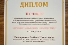 Муниципальный конкурс настольно-печатных игр по развитию познавательных способностей дошкольников среди педагогов ДОУ НМР. Воспитатель Енизеркина Л.Н. награждена Дипломом II степени в номинации «Ознакомление с социальным миром», Беляевой Е.И., Терехиной Н.И., Благодаровой И.В. вручены Сертификаты. Поздравляем! 19.12.2019