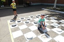 Дети и их родители с удовольствием играют в уличные шашки, которые развивают не только умственно , но и физически