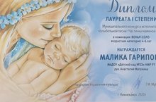 Диплом лауреата 1 й степени за участие музыкального руководителя Матухиной Анастасии Владимировны в муниципальном конкурсе исполнителей колыбельной песни "Частичка маминой души" с воспитанницейГариповой Маликой. Поздравляем!