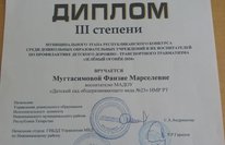 Дипломом 3 й степени награждена воспитатель Мугтасимова Ф.М. в муниципальном этапе республиканского конкурса среди ДОУ и их воспитателей по прафилактике детского дорожно-транспортного траматизма "Зеленый огонек-2020"