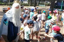 Сегодня к нам в детский сад заглянул сам бог морей Нептун. Дети повеселились на славу. Были организованы игры с водой. А бой с водными пистолетами принес огромное удовольствие в такую жаркую погоду.