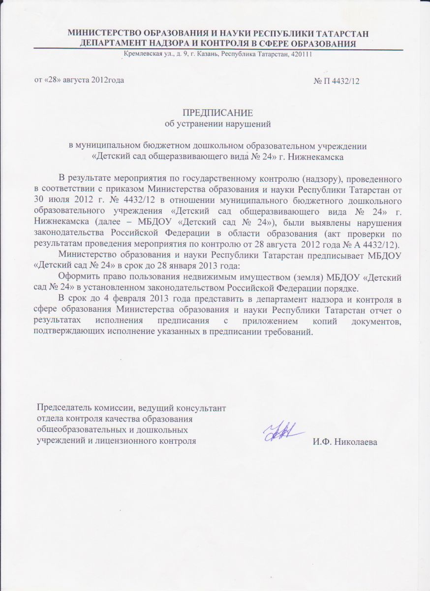 Предписание Департамента надзора и контроля в сфере образования Министерства образования и науки Республики Татарстан об устранении нарушений от 28.08.2012 года № П4432/12